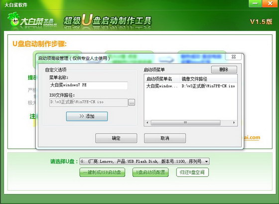 大白菜及大方便用戶制作U盤啟動(dòng)制作,提供了更高一級(jí)的定制啟動(dòng)系統(tǒng),舉例說(shuō)明: