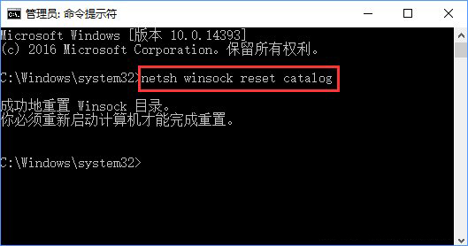 2、接著輸入:netsh winsock reset catalog 按下回車鍵,完成命令后重啟計算機即可成功啟用SENS服務。