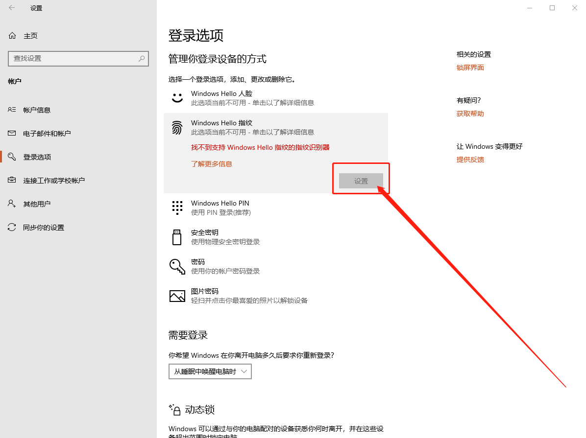 2、然后,點擊“登錄選項”,即可在左側看見5種登錄選項,其中比較適用于平板電腦的密碼類型有Windows hello人臉掃描登錄、Windows hello指紋掃描登錄以及圖片密碼。