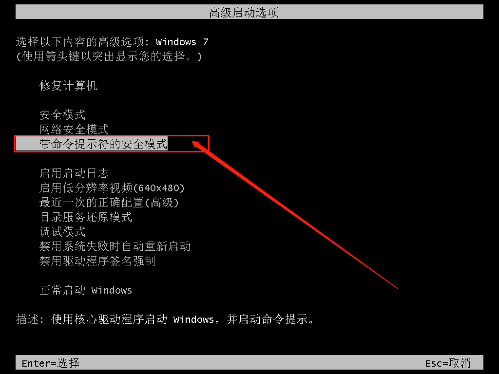 但是,仔細(xì)留意高級(jí)啟動(dòng)選項(xiàng)頁面,我們可以發(fā)現(xiàn)除了安全模式之外,下面還有一個(gè)“帶命令提示符的安全模式”。