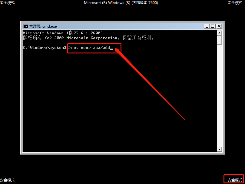 3、 隨后,會(huì)出現(xiàn)安全模式下的“命令頁面”,在頁面中輸入【net user aaa/add】并回車