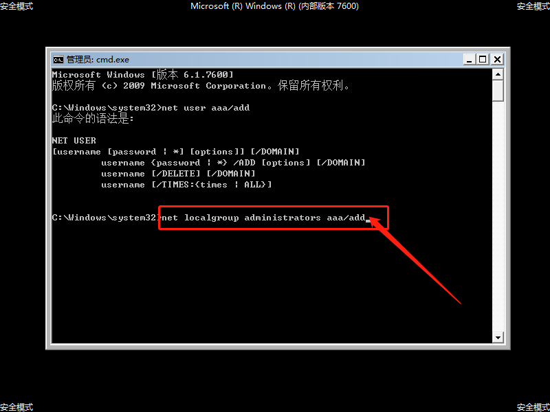4、 命令運(yùn)行完畢后,繼續(xù)輸入【net localgroup administrators aaa /add】,并回車執(zhí)行命令