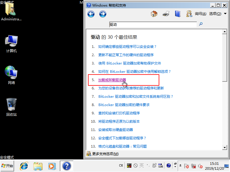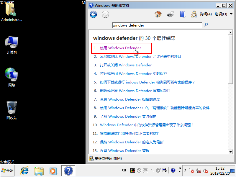 3、安全模式桌面的四個角落會有“安全模式”字樣,用于區分正常桌面。另外,可以閱讀頁面的“Windows幫助和支持”,來更好的使用安全模式。