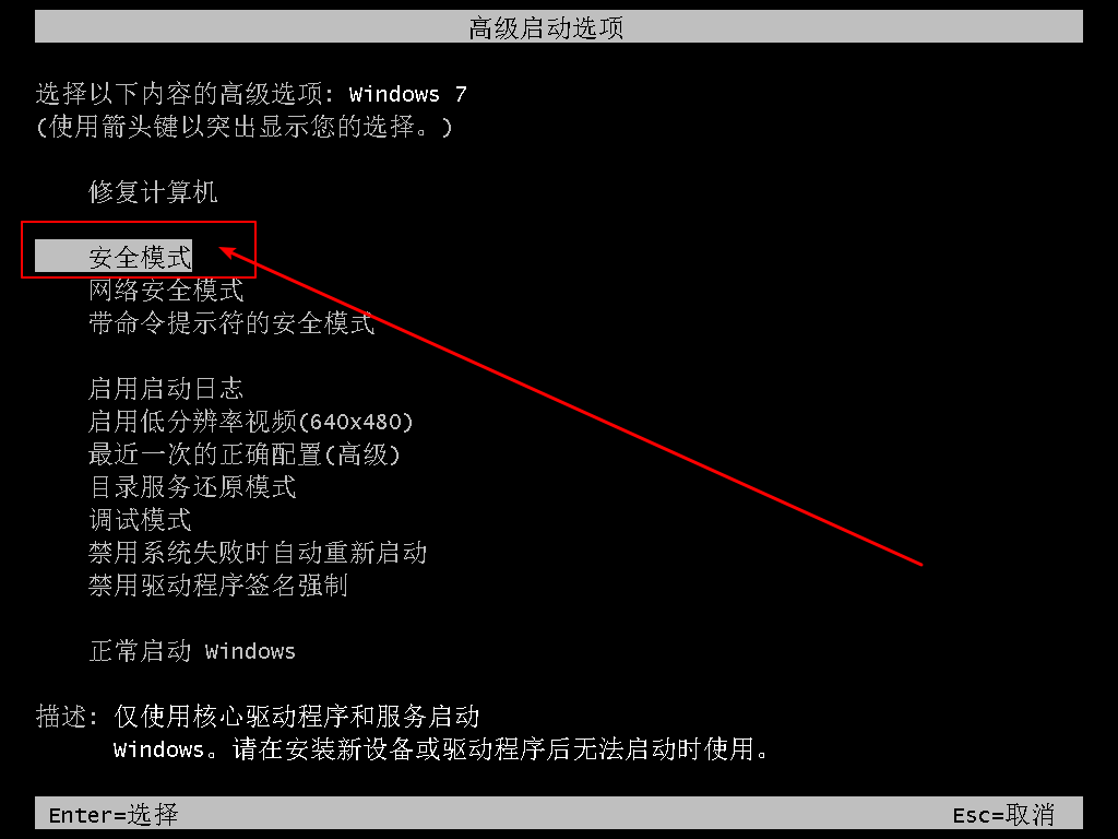 2、然后,使用上下方向鍵,移動至“安全模式”選項并回車,即可進入安全模式桌面