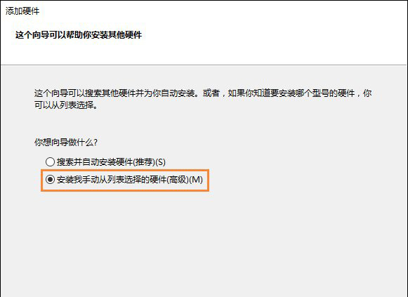 4、選擇第二個選項(xiàng)“安裝我手動從列表選擇的硬件(高級)(M)”,點(diǎn)擊下一步。