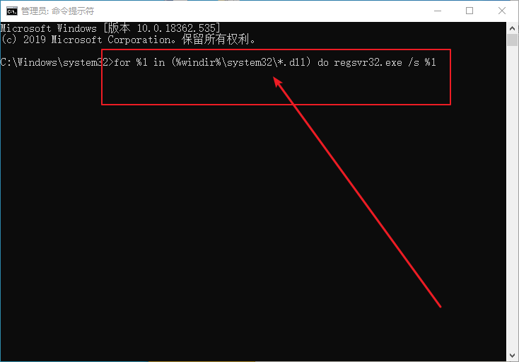 2、打開命令頁面后,輸入【for %1 in (%windir%\system32\*.dll) do regsvr32.exe /s %1】并按回車,隨后,電腦的DLL文件會重新注冊