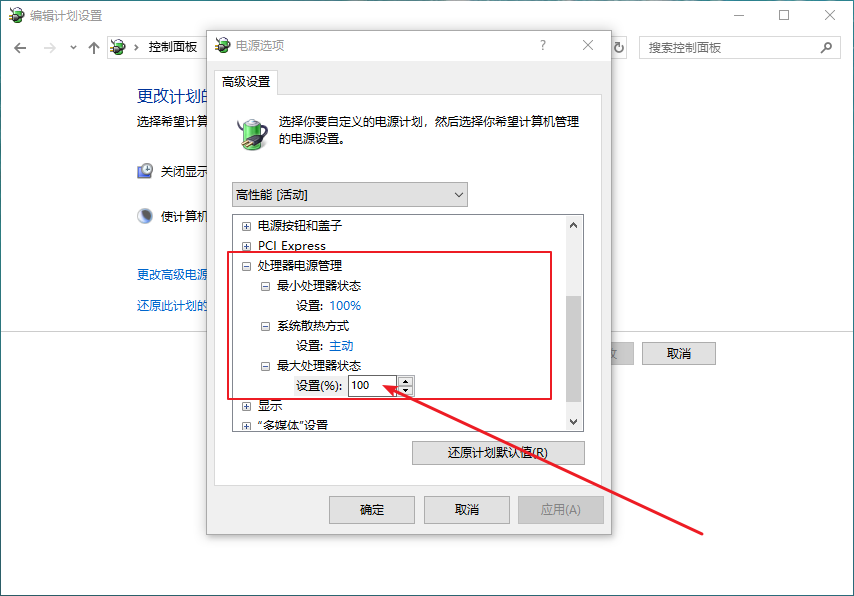 6、然后,將處理器電源管理中的最小處理器狀態調整為100%,系統散熱方式調整為主動,最大處理器狀態調整為100%;