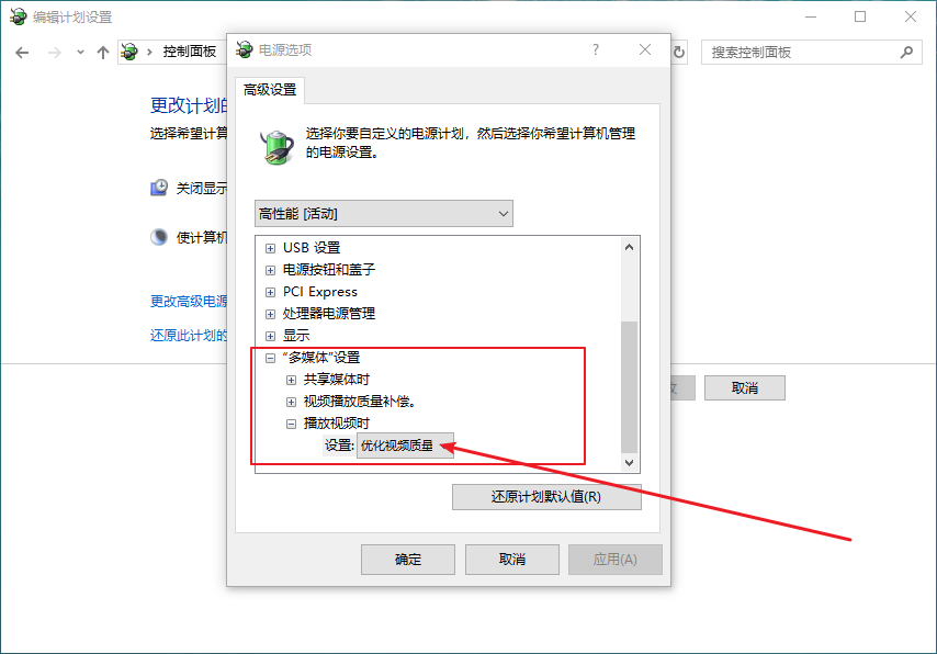 7、最后,設置多媒體設置下方的播放視頻時為“優化視頻質量”即可。
