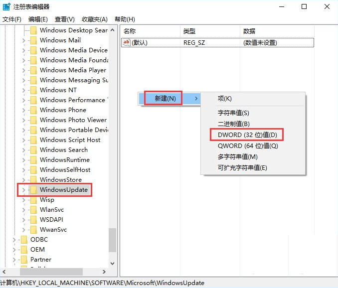 3、定位到【HKEY_LOCAL_MACHINE\SOFTWARE\Microsoft\WindowsUpdate】(沒有WindowsUpdate項的話,需要手動新建),在右邊找到SupportsUUP(沒有的話新建DWORD(32位)值,命名為該名稱即可),并修改數值數據為0;