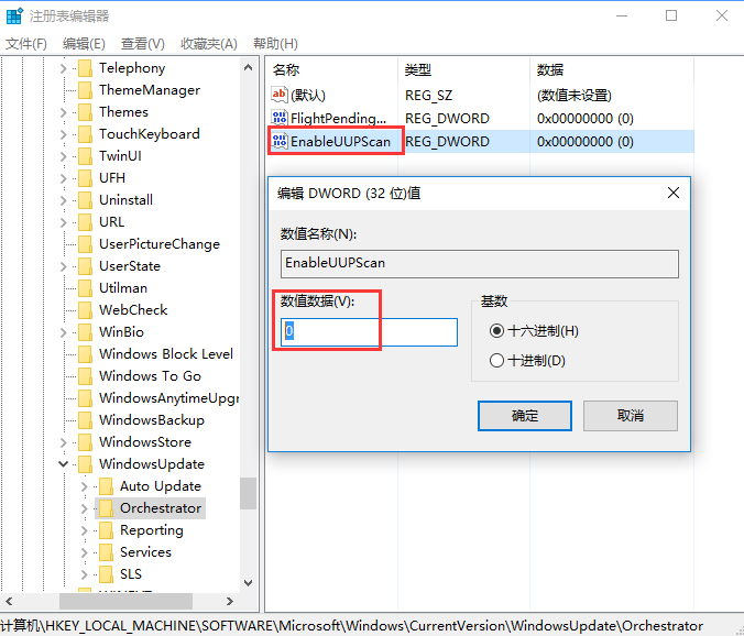 2、定位到【HKEY_LOCAL_MACHINE\SOFTWARE\Microsoft\Windows\CurrentVersion\WindowsUpdate\Orchestrator】,在右邊找到EnableUUPScan(沒有的話新建DWORD(32位)值,命名為該名稱即可),并修改數值數據為0;