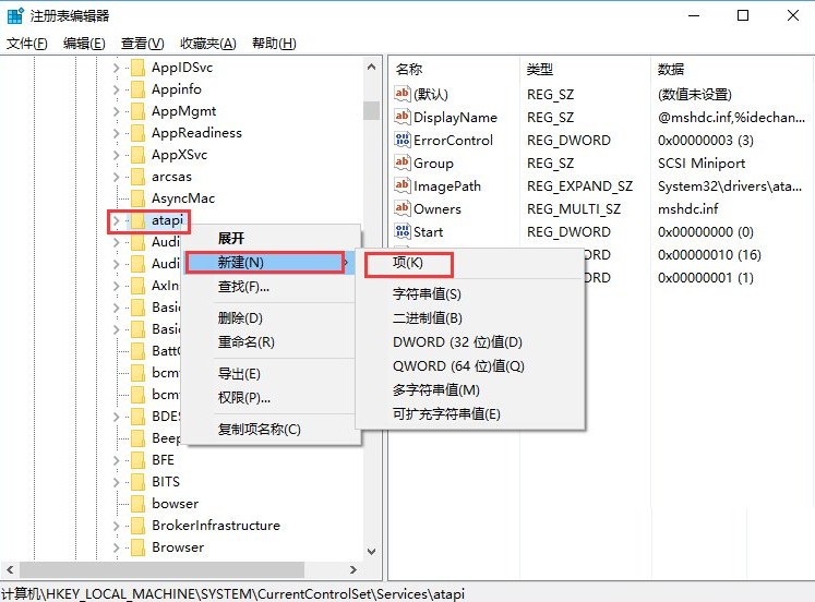 2、定位到【HKEY_LOCAL_MACHINESystemCurrentControlSetServicesatapi】,在atapi點擊右鍵,新建項,命名為【Controller0】;