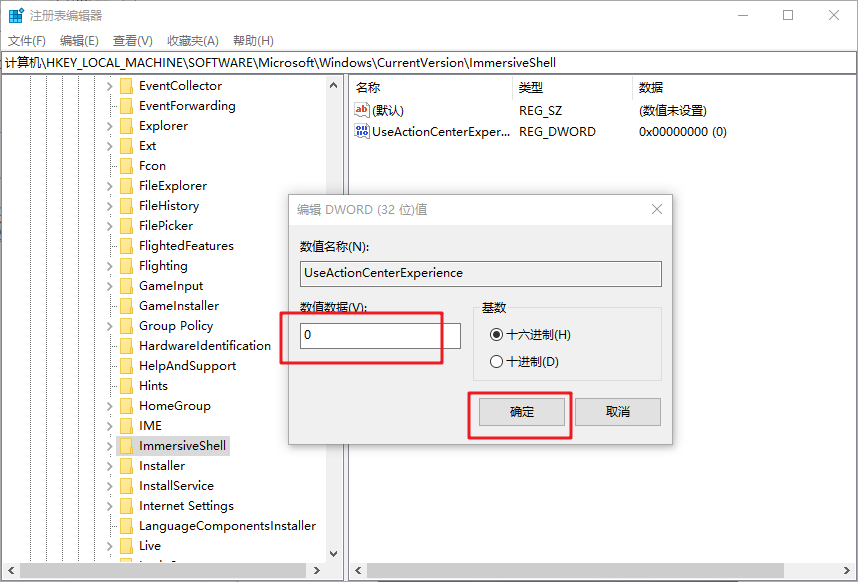 3、雙擊UseActionCenterExperience值,修改數值數據為【0】。