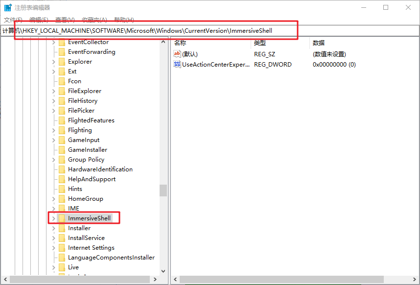 2、定位到目錄【HKEY_LOCAL_MACHINE\Software\Microsoft\Windows\CurrentVersion\ImmersiveShell】