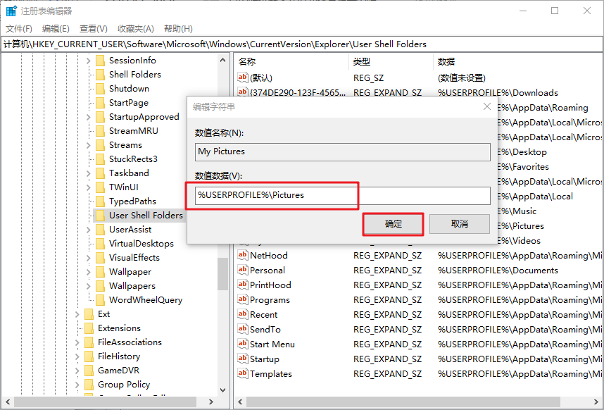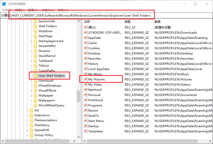 2、定位到【HKEY_CURRENT-USER\Software\Microsoft\Windows\CurrentVersion\Explorer\User Shell Folders】,雙擊“My Pictures”