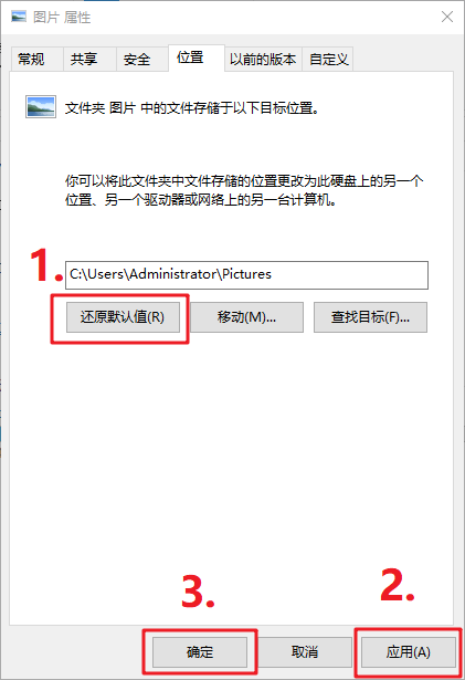 5、彈出“圖片 屬性”對話框,切換到“位置”選項卡,在其中點擊“還原為默認值”,并依次點擊“應用”、“確定”,即可恢復保存默認路徑。