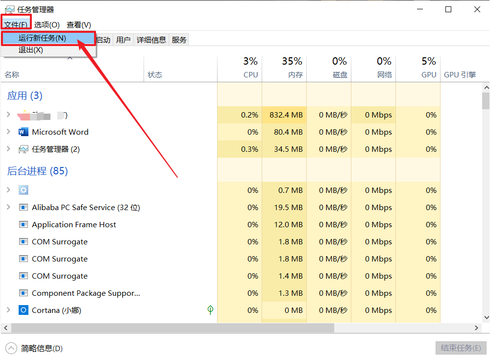2、在任務管理器的界面,選擇【文件】-【運行新任務】;