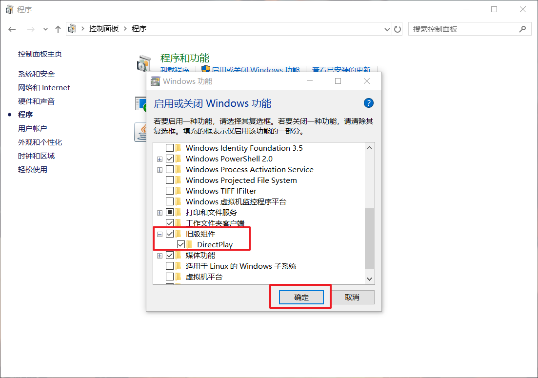 4、 然后,在打開的Windows功能設置中,找到并展開“舊版組件”,勾選“DirectPlay”功能,點擊下方的“確定”
