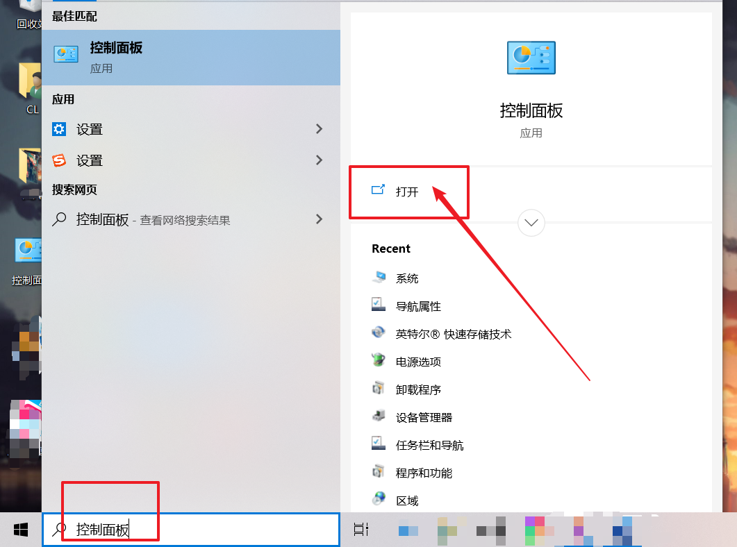 1、 在桌面搜索框中輸入并打開“控制面板”