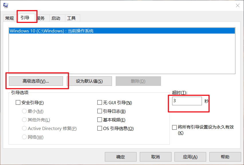 7、 然后,點擊“引導”選項卡,將“超時”設置為“3”秒,并選擇點擊“高級選項”