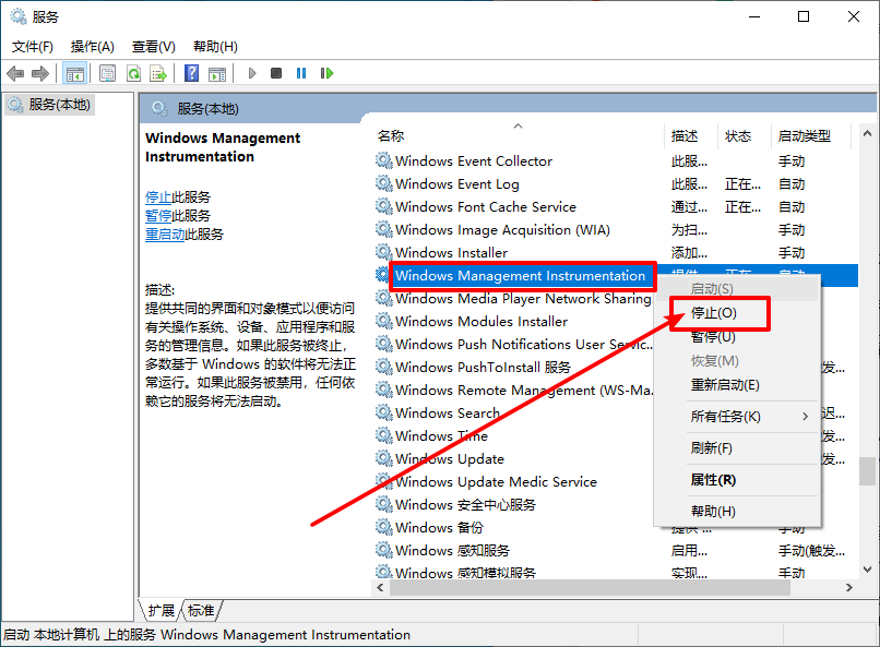 2、然后,在右側頁面找到并右鍵Windows Management Instrumentation服務,點擊“停止”即可