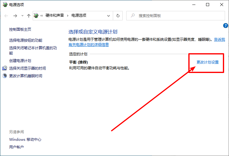3、進入電源頁面周,點擊當前電源計劃右側的“更改計劃設置”