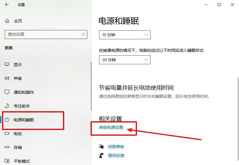 2、然后,點(diǎn)擊左側(cè)的“電源和睡眠”,再點(diǎn)擊右側(cè)的“其他電源設(shè)置”
