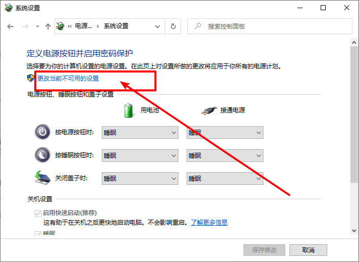 4、進(jìn)入設(shè)置頁面后,點(diǎn)擊“更改當(dāng)前不可用的設(shè)置”