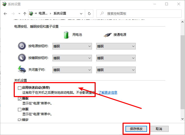 5、隨后,取消勾選“啟用快速啟動(dòng)(推薦)”,最后重啟計(jì)算機(jī)即可。