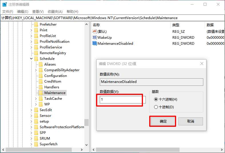 4、雙擊新建值MaintenanceDisabled,將其數值數據修改為1,保存并重啟電腦關閉自動維護功能
