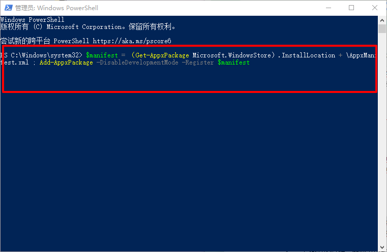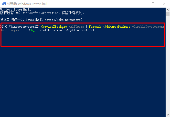 【Get-AppXPackage -AllUsers | Foreach {Add-AppxPackage -DisableDevelopmentMode -Register “$($_.InstallLocation)\AppXManifest.xml】