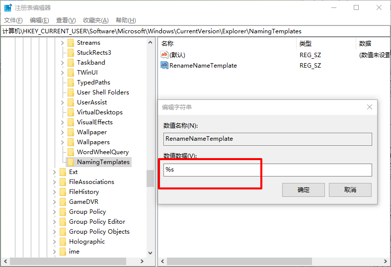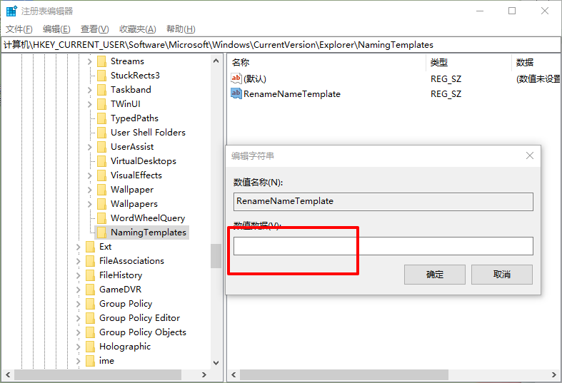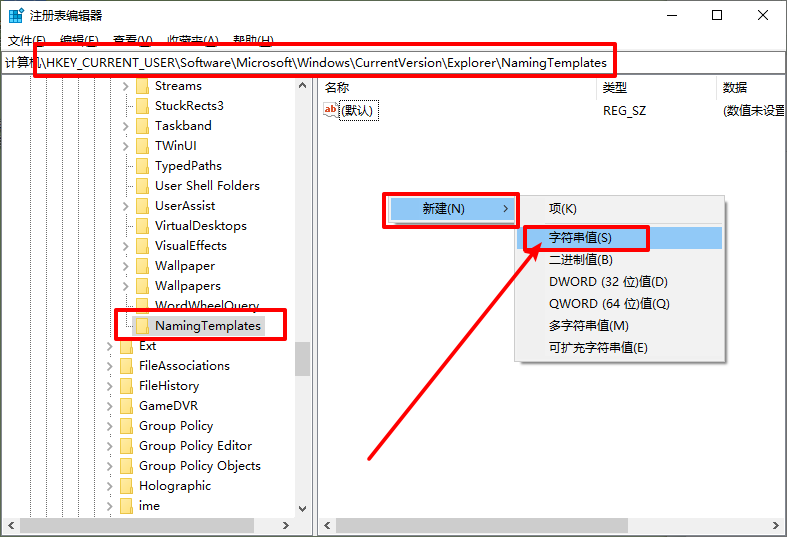 4、選中新建的NamingTemplates項后,在右側窗口中新建一個名為RenameNameTemplate的字符串值