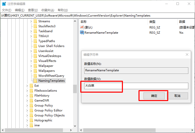7、如果你把RenameNameTemplate的數值數據設置為其它的,例如“大白菜”,那么再新建項目時,所有的新建項目的名稱都是“大白菜”了。