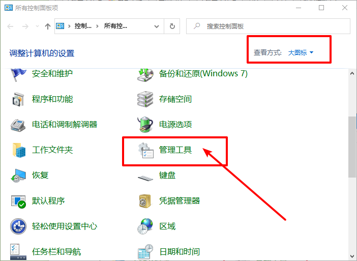 2、將查看方式設置為“大圖標”之后,點擊“管理工具”