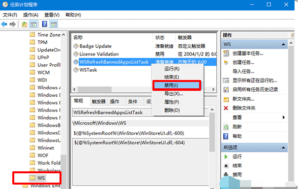 4、進入任務計劃程序頁面后,按照以下路徑展開“Microsoft\Windows\WS”,然后如圖所示,右鍵“WSRefreshBannedAppsListTask”,選擇“禁用”即可