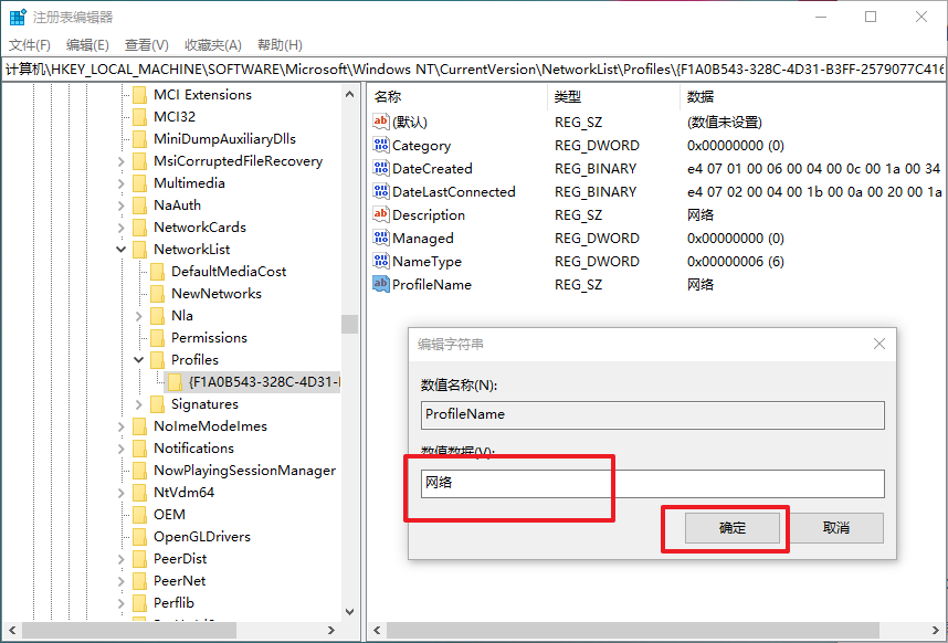 5、 選中需要修改的子項后,在右側會出現一系列注冊表鍵值,其中ProfileName就是網絡名稱,雙擊打開并輸入你想修改的名字,點擊“確定”即可
