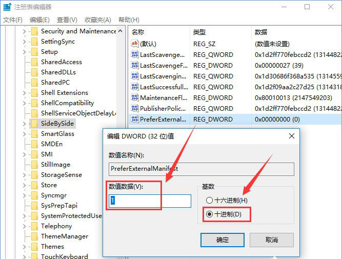 3、雙擊打開“PreferExternalManifest”,將數值數據修改為“1”,然后修改為“十進制”點擊確定