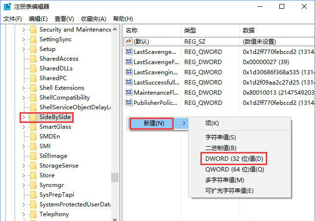 【HKEY_LOCAL_MACHINE/SOFTWARE/Microsoft/Windows/CurrentVersion/SideBySide】,在右側單擊右鍵點擊【新建】-【DWORD(32位)值】,將改制命名為【 PreferExternalManifest】