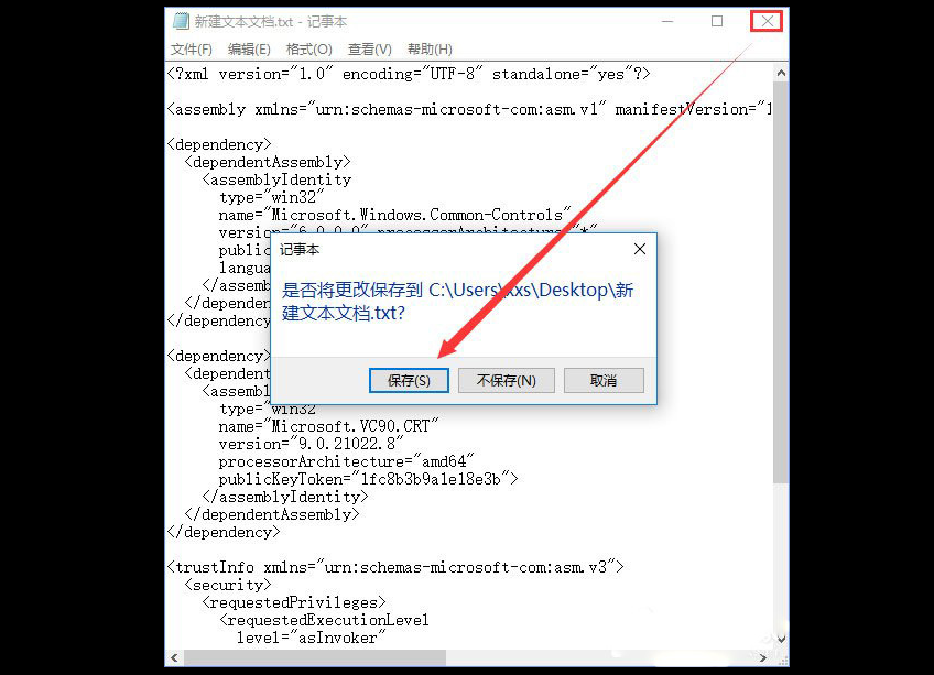 5、隨后,關閉新建文本文檔,并在彈窗中點擊保存;