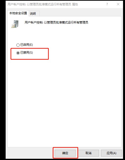 3、在右側找到并雙擊打開【用戶賬戶控制:以管理員批準模式運行所有管理員】,選擇【已禁用】點擊確定;
