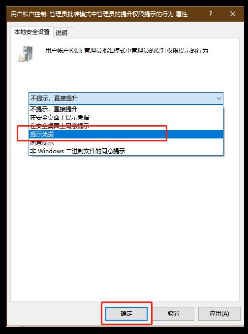 2、找到并雙擊【計算機配置-》Windows設置-》安全設置-》本地策略-》安全選項-》用戶帳戶控制:管理審批模式下管理員的提升提示行為-》】,將修改成“提示憑據”;