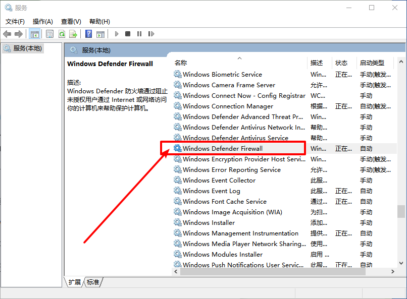 2、打開服務列表,找到“Windows Defender firewall”服務項;