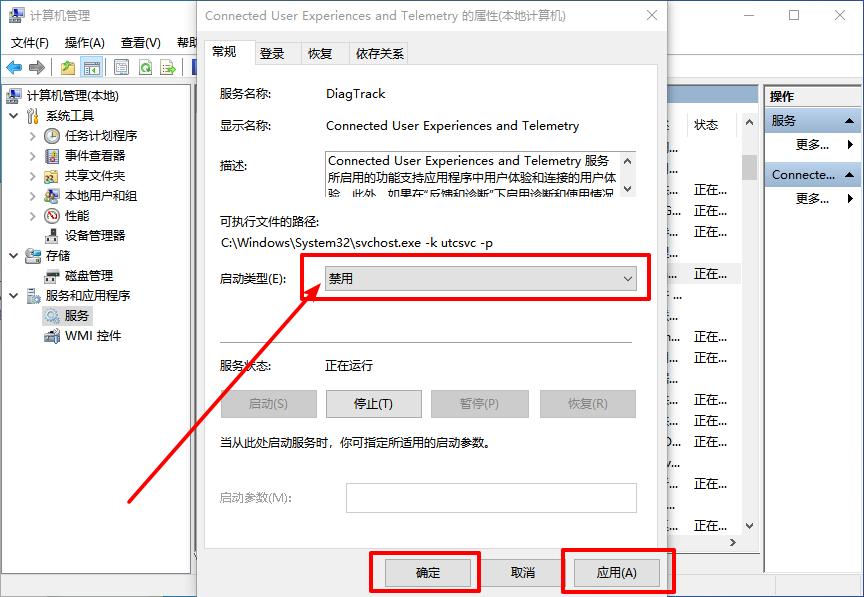 3、在Connected User Experiences and Telemetry的屬性窗口中,將啟動(dòng)類型改為“禁用”,然后“應(yīng)用”并“確定”即可。