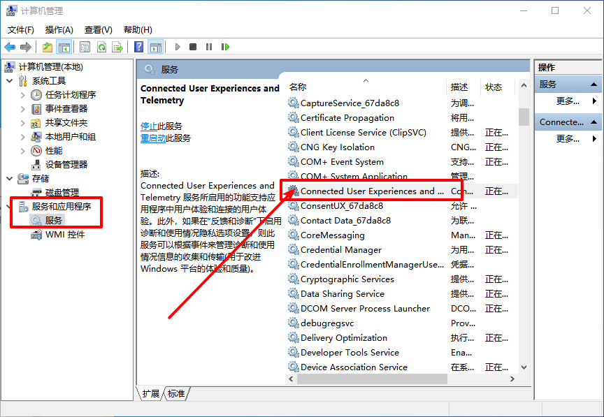 2、然后,依次點(diǎn)擊“服務(wù)和應(yīng)用程序-服務(wù)”,找到“Connected User Experiences and Telemetry”服務(wù),并雙擊打開(kāi);