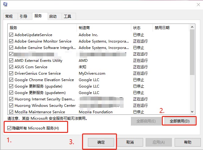 2、切換到【服務(wù)】選卡,勾選【隱藏Microsoft服務(wù)】,然后點(diǎn)擊【全部禁用】點(diǎn)擊確定,然后重啟電腦;