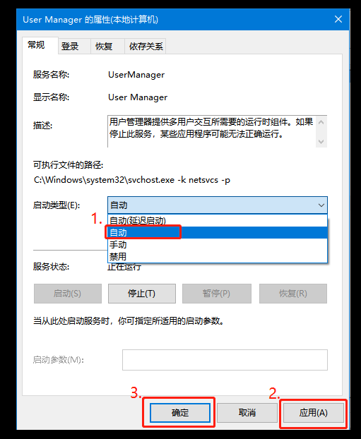 4、在屬性頁面,將“啟動類型”更改為“自動”,并點擊“應用”,最后“確定”即可
