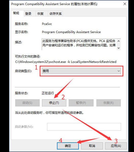 2、找到“Program Compatibility Assistant Service”服務(wù),雙擊打開,將啟動類型修改為“禁用”,點擊【停止】-【應(yīng)用】并【確定】即可!